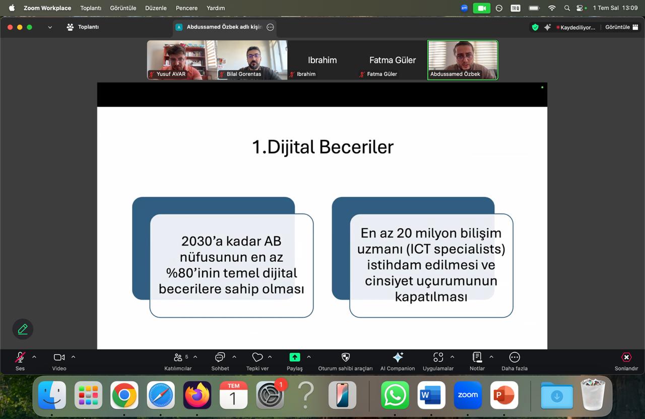 Arş. Gör. Abdussamed Özbek, “Avrupa Dijital On Yılı ve Gençlik İçin Temel Hedefler” başlıklı sunumunda Dijital On Yılı (Digital Decade 2030) programının temel hedefleri olan dijital beceriler, dijital altyapılar, dijital işletmeler ve dijital kamu hizmetleri hakkında bilgi verdi. Özbek ayrıca yapay zeka meslekleri, Avrupa Bulut Federasyonu, e-sağlık (e-health) ve e-adalet (e-justice) konularına da değindi.